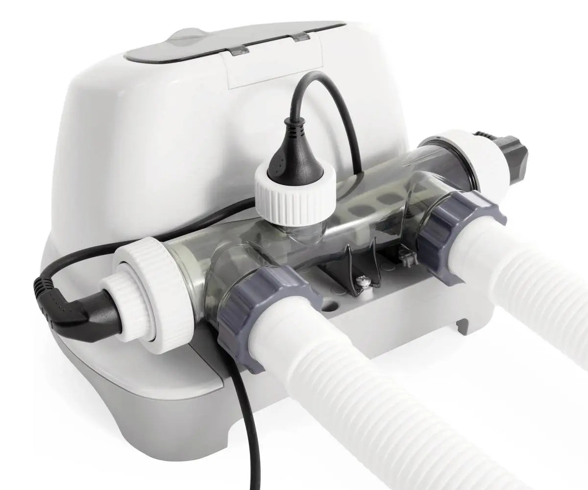 INTEX Salzwassersysteme sind eine praktische Lösung für die Poolpflege bei vielen Aufstellpools. Durch den integrierten Elektrolyseprozess wird aus im Wasser gelöstem Salz aktiv wirksames Chlor erzeugt, das zur laufenden Wasserdesinfektion beiträgt. Dadurch lässt sich der Bedarf an klassisch zugesetztem Chlor je nach Nutzung und Wasserbelastung deutlich reduzieren.